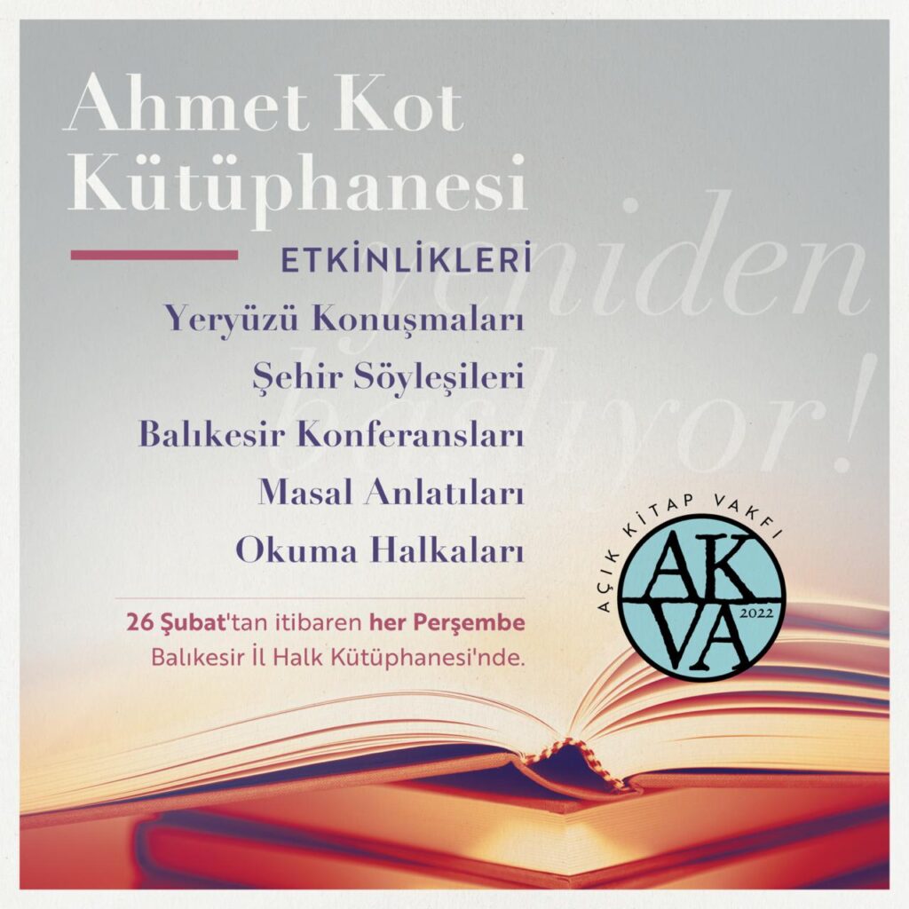 Açık Kitap Vakfı’nın yaptığı duyuruda, Ahmet Kot Kütüphanesi Etkinlikleri’nin her perşembe Balıkesir İl Halk Kütüphanesi’nde kaldığı yerden devam edeceği ifade edildi.[1]