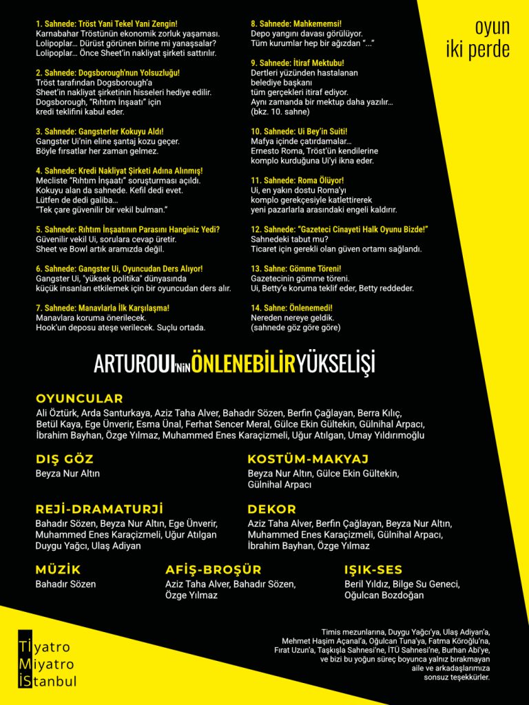Arturo Ui’nin Önlenebilir Yükselişi kaç farklı şekilde sahnelenebilir? Dün akşam İstanbul Teknik Üniversitesi Maçka Kampüsü Mustafa Kemal Amfisi’nde Arturo Ui’nin prömiyerini gerçekleştiren TİMİS Oyuncuları’nın performansını izlediğimde bir oyuncu grubunun ideal olanı bulma noktasındaki gayretinin imkansızlıklar içinde dahi neleri başarabileceğine şahit oldum. Oyunu izlerken beğeni duyguma galebe çalan bir ikinci duygu da bana iki perde boyunca eşlik etti: şaşkınlık. Nihayetinde üniversite öğrencilerinden oluşan oyuncu grubunun performansını izleyeceğimi bilerek, beklentimi çok da yükseltmeden gittiğim bir oyunun Devlet Tiyatroları’nda izlediğim çoğu oyunun gerek eserin ruhunu kavramada gösterilen yetkinlik gerek oyunun genel ritmi gerekse öne çıkan birden fazla oyunculuk performansıyla daha iyi olduğunu görmek, şaşırtıcıydı. Bu hususları açmakta yarar görüyorum.