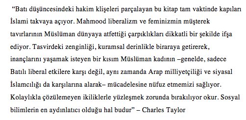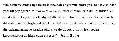 Nitelikli telif ve çeviri eserlerle yayın dünyasındaki yerini her geçen gün daha da sağlamlaştıran Açılım Kitap, Saba Mahmood’un “Takva Siyaseti” (Politcs of Piety) adlı çalışmasını yayıma hazırlıyor. Yayınevinin Twitter adresinden kitabın duyurusu bugün yapılırken kitaptan kısa bir bölüm ile Judith Butler ve Charles Taylor’ın takrizleri okurun dikkatine sunuldu.